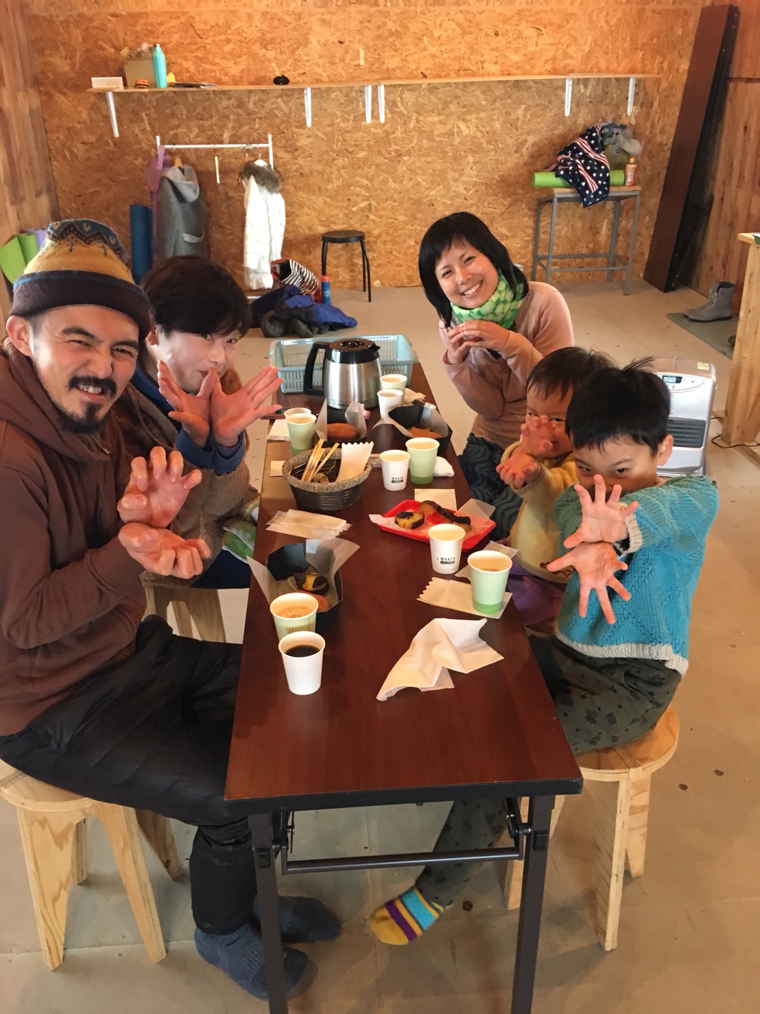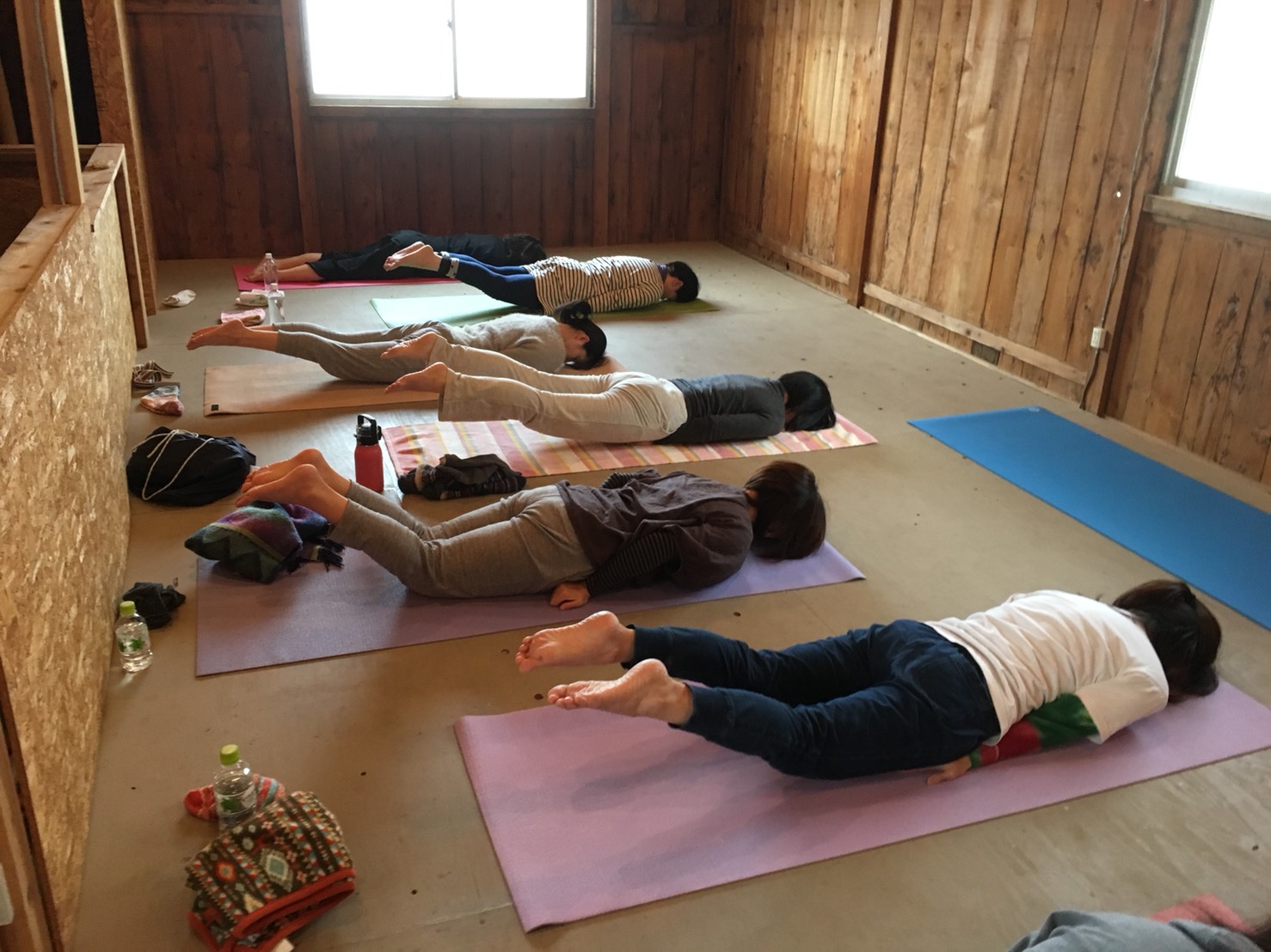 ドーナツ小屋の2階で、みなさん楽しくヨガをしています。